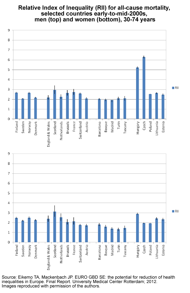 The Figure below (taken from a study published in 2012) shows that relative inequalities in mortality are not just greater in Scotland compared to England & Wales, but also compared with elsewhere in Western Europe and parts of Eastern Europe as well. Note that the inequality measure presented in these charts is defined differently than those presented in other charts in this section.